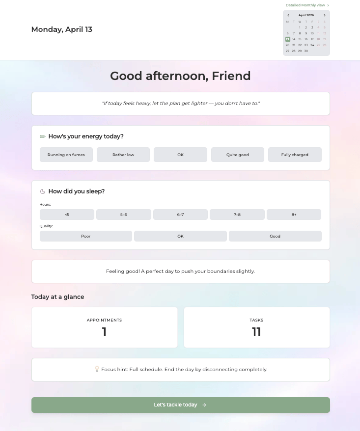In der Entwicklung befindet sich bereits die Kaleissera-App — ein Ort, an dem Termine, Fürsorge und der eigene Alltag zusammenkommen. Ruhig, übersichtlich und nah an dem, was wirklich gebraucht wird. Ein Werkzeug, das sich dem Leben anpasst — nicht umgekehrt.